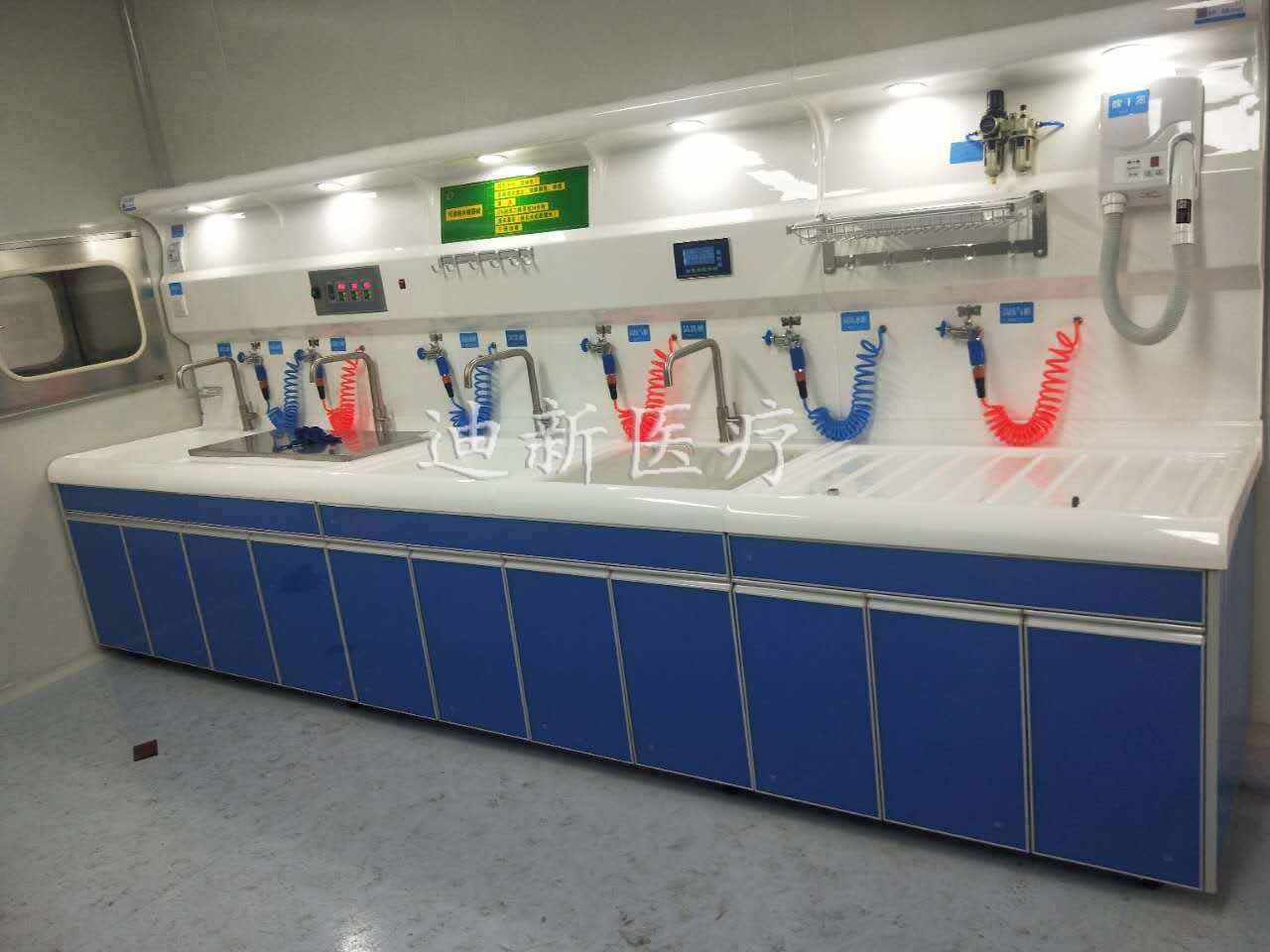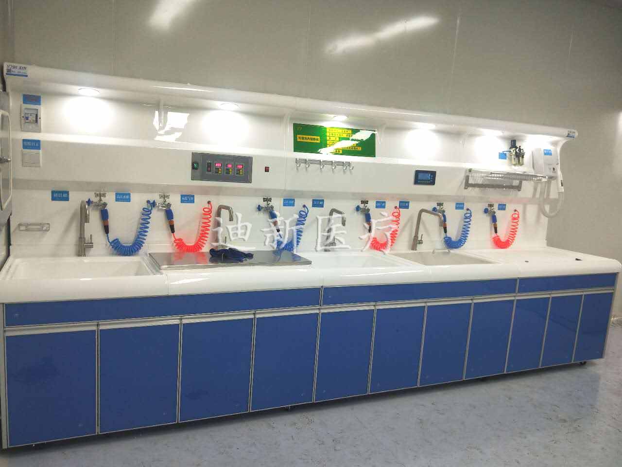 本套清洗裝置整體外觀簡潔大方,結(jié)構(gòu)緊湊,輪廓清洗流暢,符合人體工程學設(shè)計理念,主要采用多槽分級,獨立操作的原則,整個過程實現(xiàn)流水化操作,級級分明,不受干擾,有效防止了各種交叉感染。